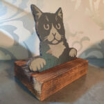 Handgefertigte Schiefer-Katze auf abgeflammtem Holzständer