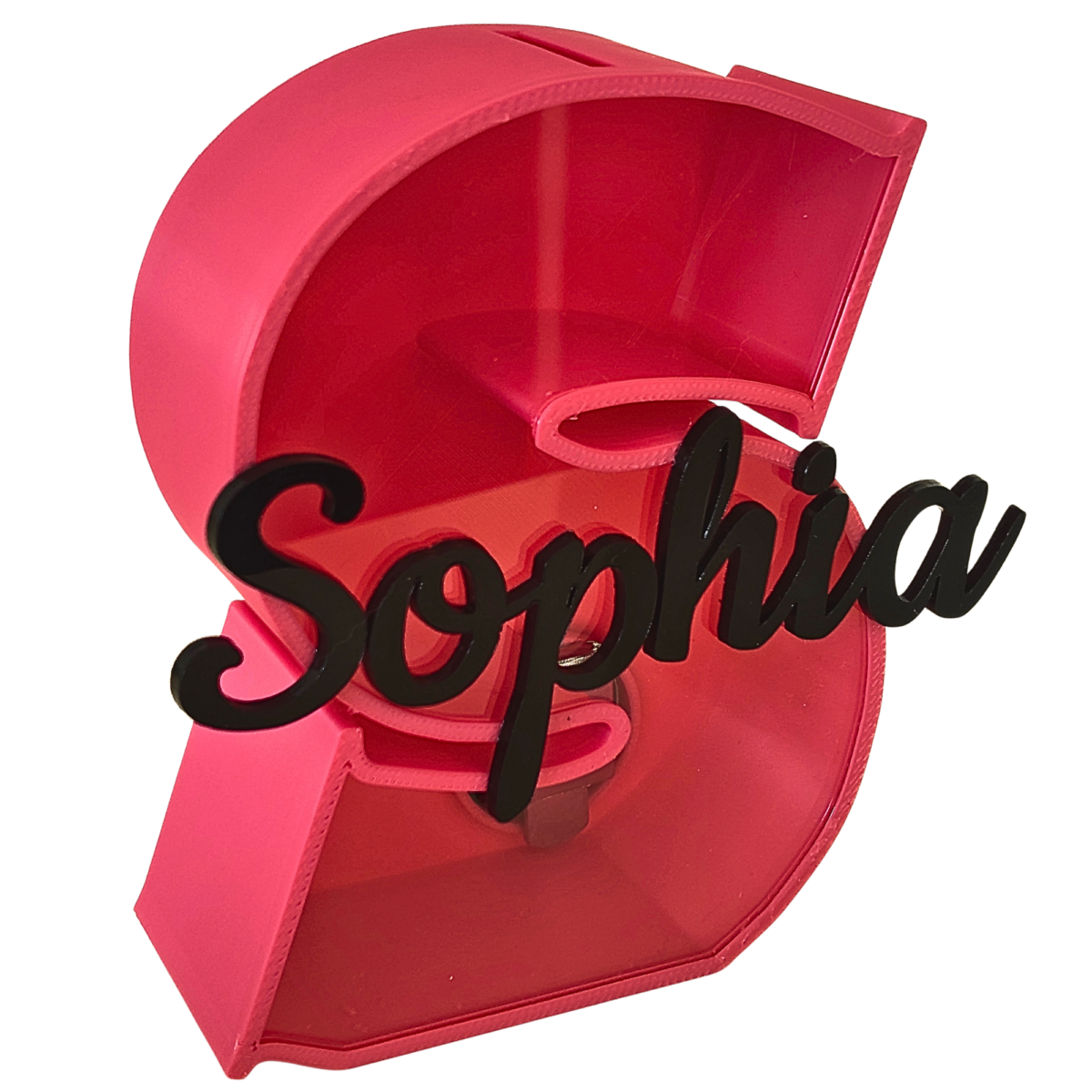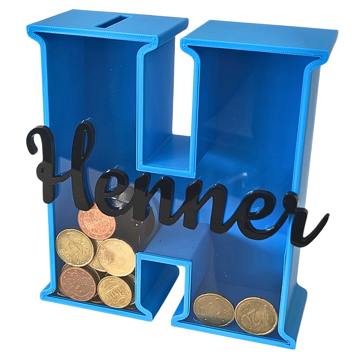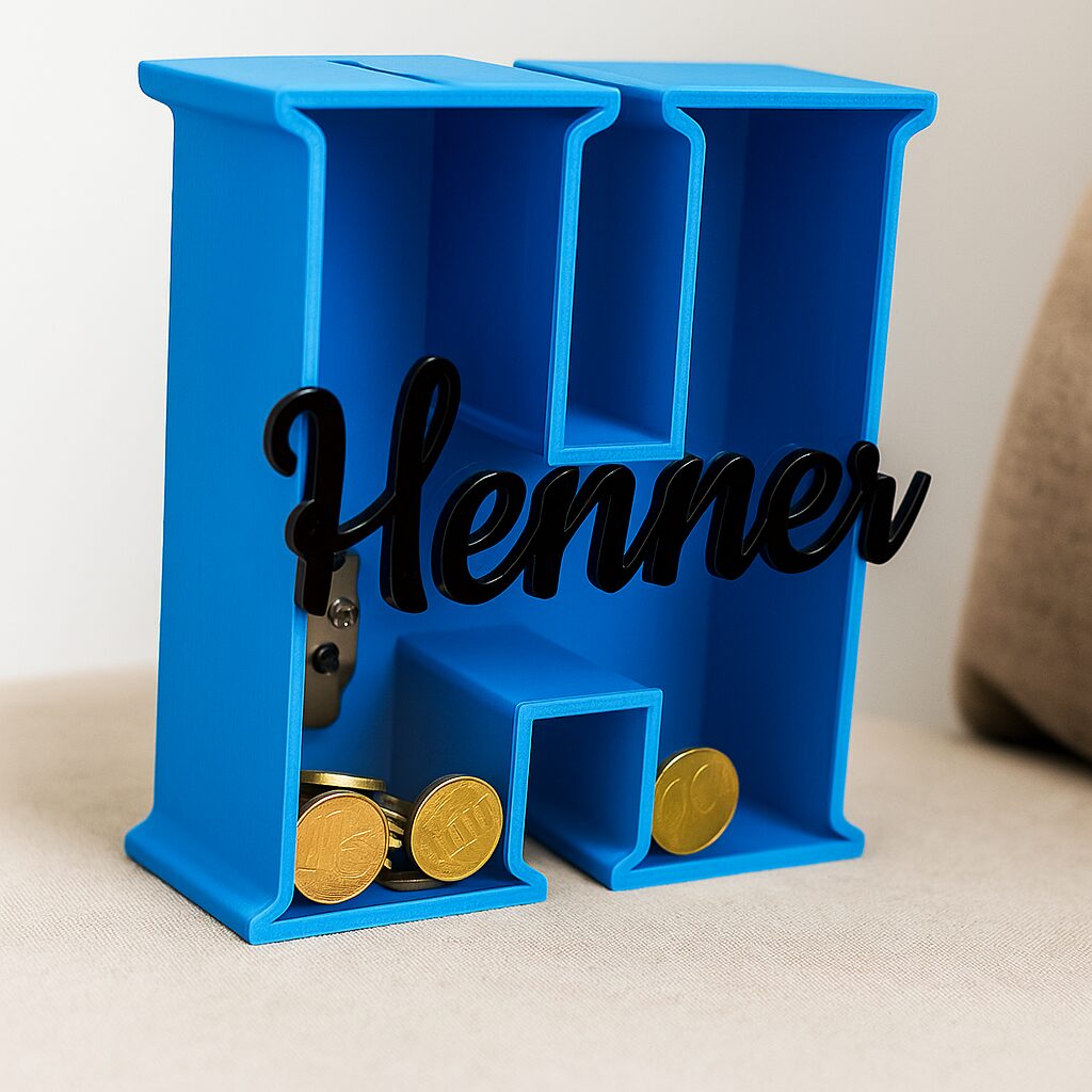 Mit unserer neuen Buchstaben-Spardose bekommt Sparen endlich einen persönlichen Touch. Jede Spardose besteht aus einem 3D-gedruckten Anfangsbuchstaben, kombiniert mit einer glasklaren Acrylfront und einem hochwertigen Namenszug aus glänzendem schwarzem Acryl. So entsteht ein modernes, frisches Design, das in jedem Kinderzimmer auffällt.